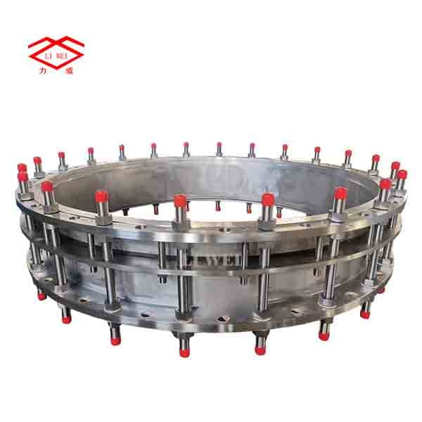 该产品采用金属铸造或焊接组成,松套部位选用梯形圆环橡胶密封圈,在压盖和螺栓的作用下,利用橡胶的压缩弹性变形原理。迫使密封圈变形于接头本体伸缩管外壁之间进行静密封。金属和密封圈严格按使用性能及用户要求选用。材质外部涂装高强度防腐漆料,各部连接螺栓为高强度碳钢或不锈钢制作。因为本体与伸缩管之间有一定间隙,使它具有一定的轴向和径向位移。在管道中能有效的补偿和缓解管道盲板推力,又能便于水泵、阀门的安装维修和更换,实为管道安装及运行中最为理想的配套产品。